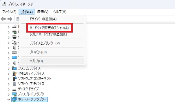上にあるメニュー「操作」→「ハードウェア変更のスキャン」をクリックします。