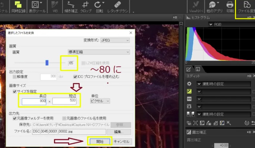 - JPGに変換するときは、画質を“標準”または“やや高画質”に設定
