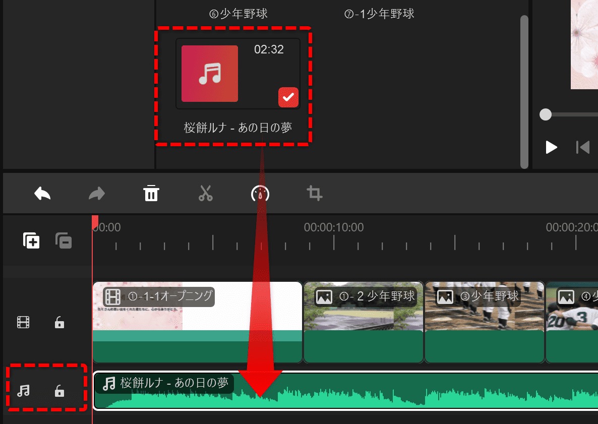 素材を下のタイムラインへドラッグ。順番を並べ替えたり、不要部分をハサミアイコンでカット 。