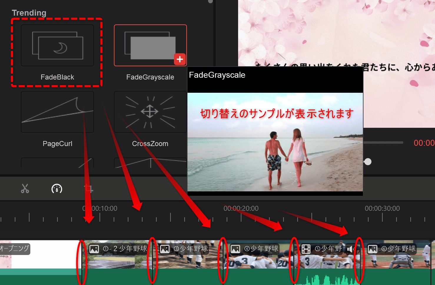 「Transitions」タブから好きなエフェクトをクリップの境目にドラッグ(サンプルプレビューあり)