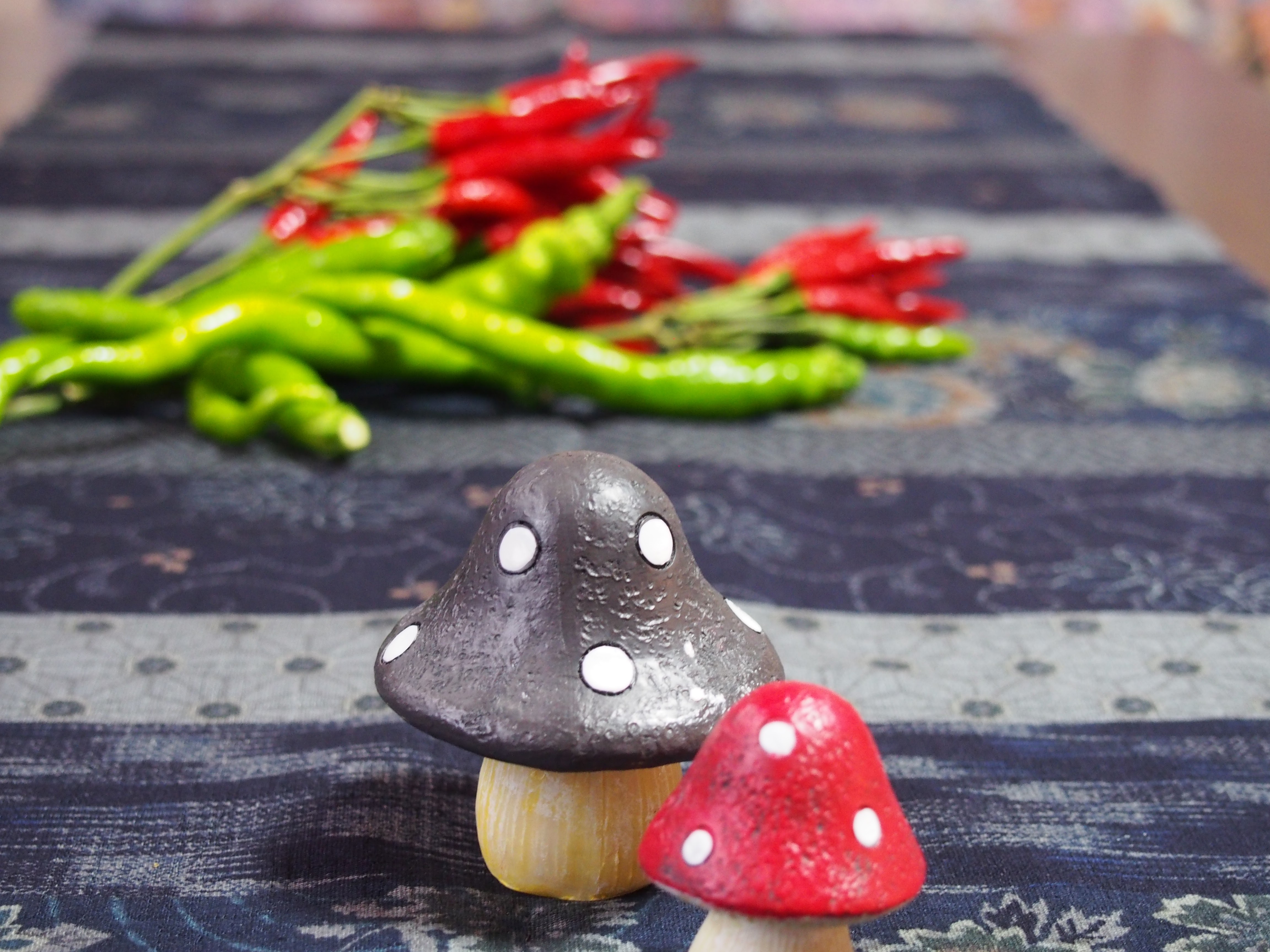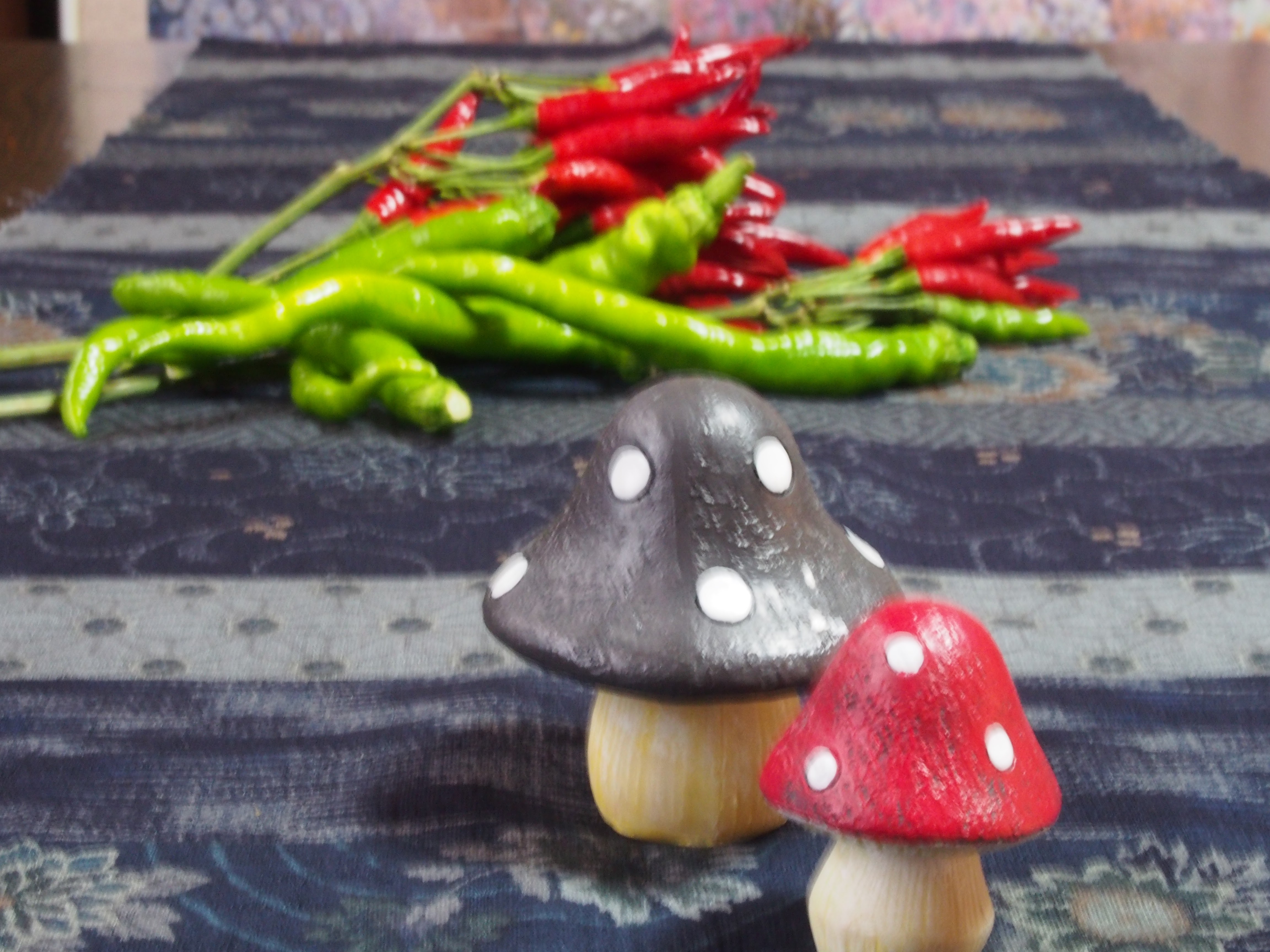 前のキノコと後ろの唐辛子の距離は、60センチあいています。