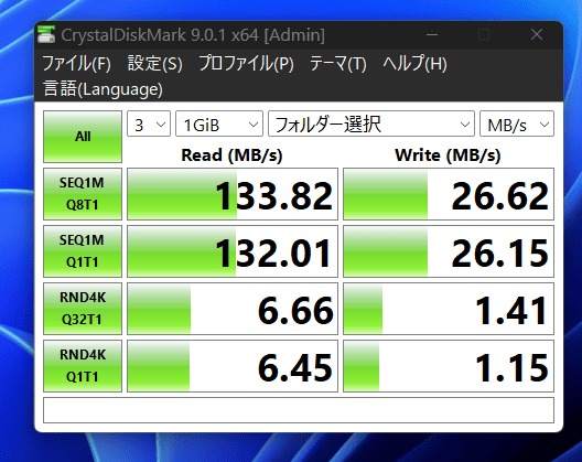 実際に「SanDisk Ultra Fit 64GB USB 3.2(SDCZ430-064G-J46)」をテストしたところ、CrystalDiskMarkでの計測結果は 読み込み約133MB/秒、書き込み約26MB/秒 でした。