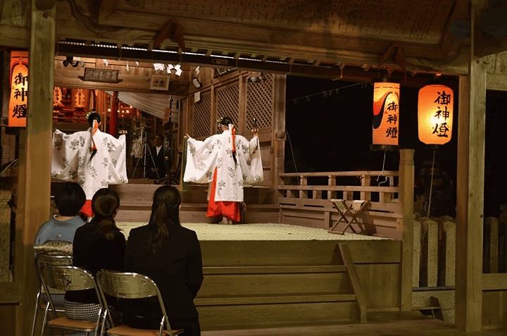 宵宮の区長宅への来宅は、禰宜(ねぎ)のご祈祷の後、宵宮の「浦安の舞」や餅まき(開催年によって変動あり)が終わってからとなるため、だいたい19時前後になると予想されます。
